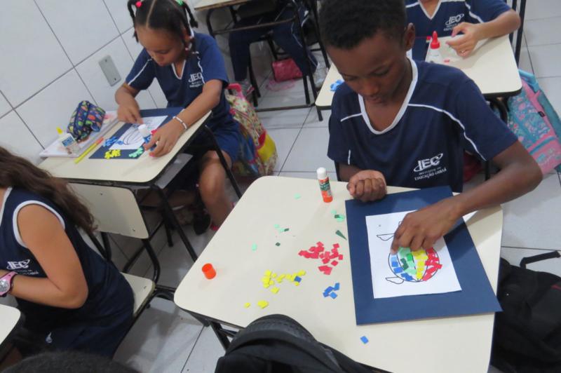 As aulas de arte do IEC estão muito criativas! Na nossa última aula, os alunos do 3º ano realizaram a montagem de um lindo mosaico, estudando as formas.